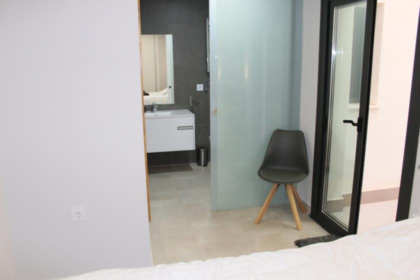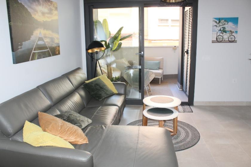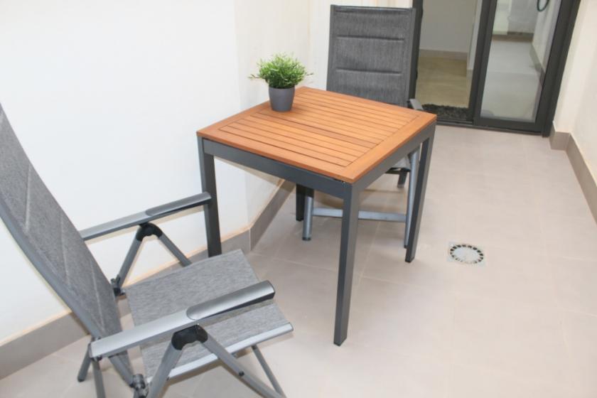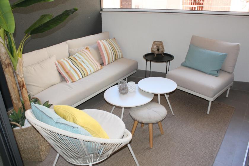 Genom vardagsrummet når du balkongen med utsikt över gatan och en tilltalande sittgrupp. Semesterlägenheten har även en uteplats med bord och stolar och det finns luftkonditionering i hela lägenheten.