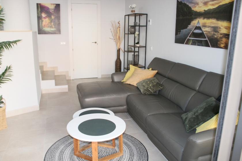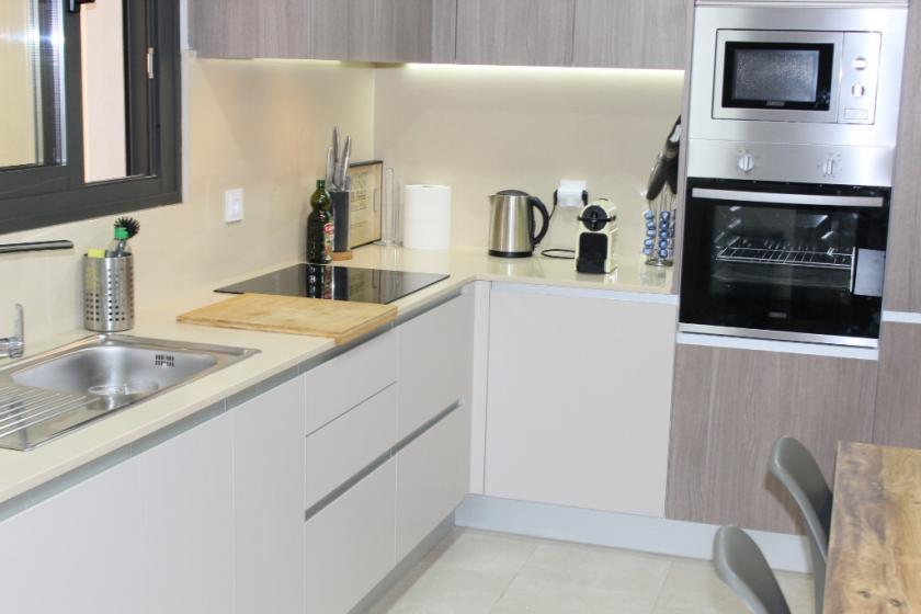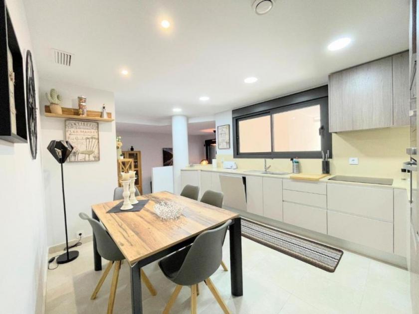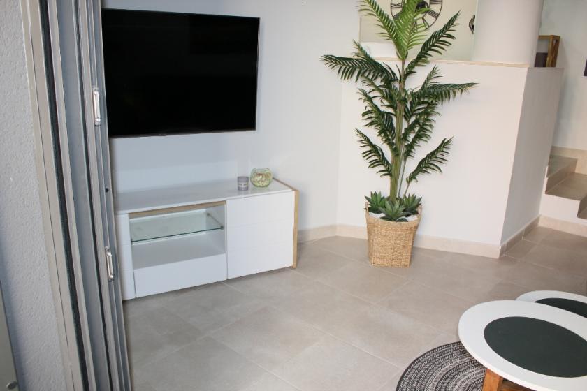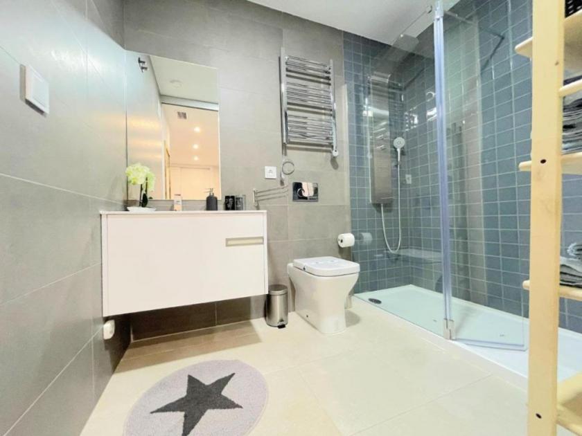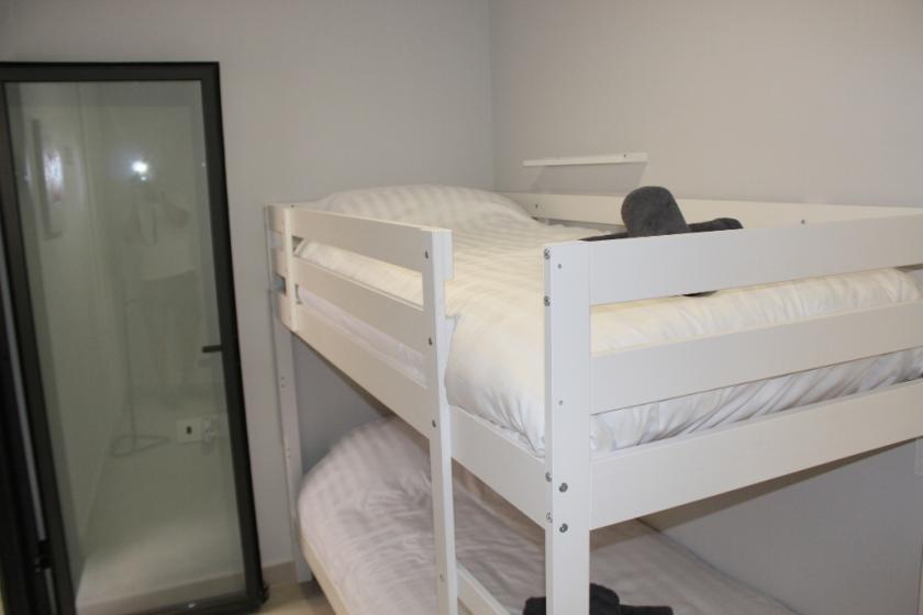 Lägenheten har 3 sovrum med inbyggda garderober, 1 med våningssäng och 2 med dubbelsäng, 2 badrum med duschkabin, ett stort öppet kök med alla vitvaror och ett modernt vardagsrum i 2 plan intill med smart-TV med Google Chrome cast och WiFi.