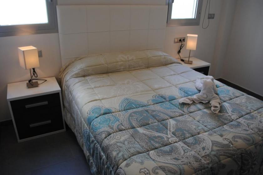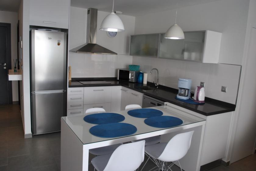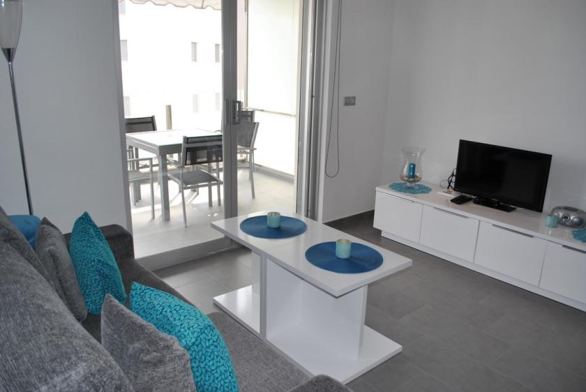 Denna modernt möblerade lägenhet ligger på 7:e våningen, är en del av ett nytt komplex och är utrustad med modern komfort. Vardagsrummet har ett modernt öppet kök med en fullt utrustad diskmaskin. Det finns 2 sovrum: 1 dubbelrum och 1 rum med 3 enkelsängar (1 våningssäng), samt 2 badrum med duschmöjligheter. Det finns luftkonditionering (varm eller kall), satellit-TV och Wi-Fi.