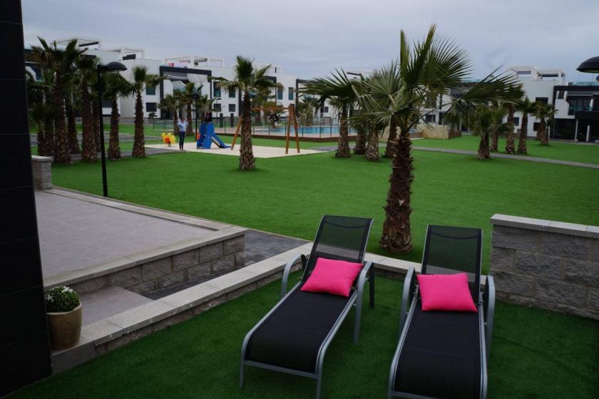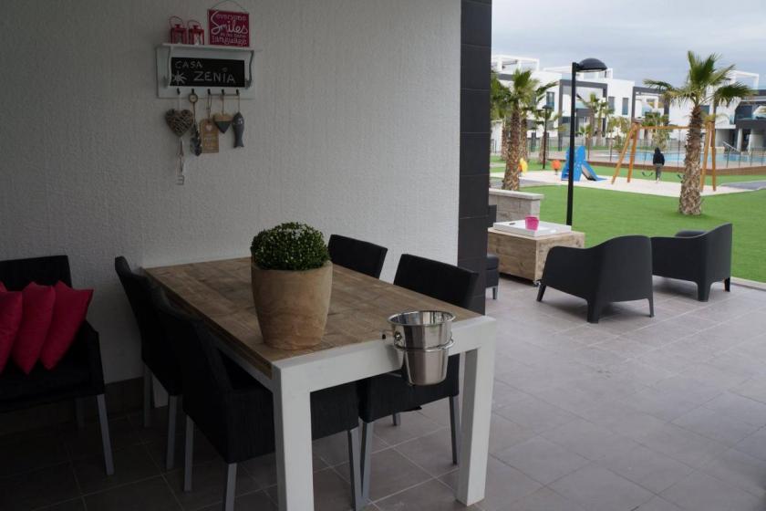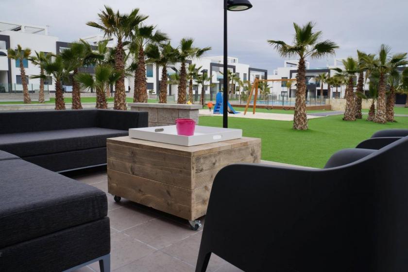 Denna lägenhet är en del av en urbanisering med flera lägenheter runt en stor gemensam pool. Det finns också en stor barnpool och en bubbelpool. Runt poolen är det anlagt konstgräs, vilket ger området ett mycket trevligare och prydligare utseende. Barnen kan också ha kul på lekplatsen med en gunga. Två bouleborrar erbjuder nöje för både unga och gamla. De flesta ägarna här är belgare, holländare och skandinaver. Även om alla respekterar varandras privatliv är det lätt att träffa de andra besökarna.