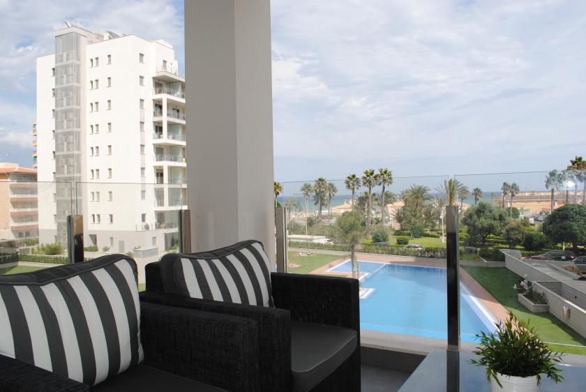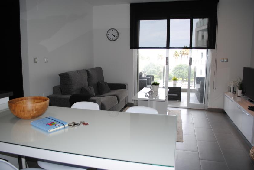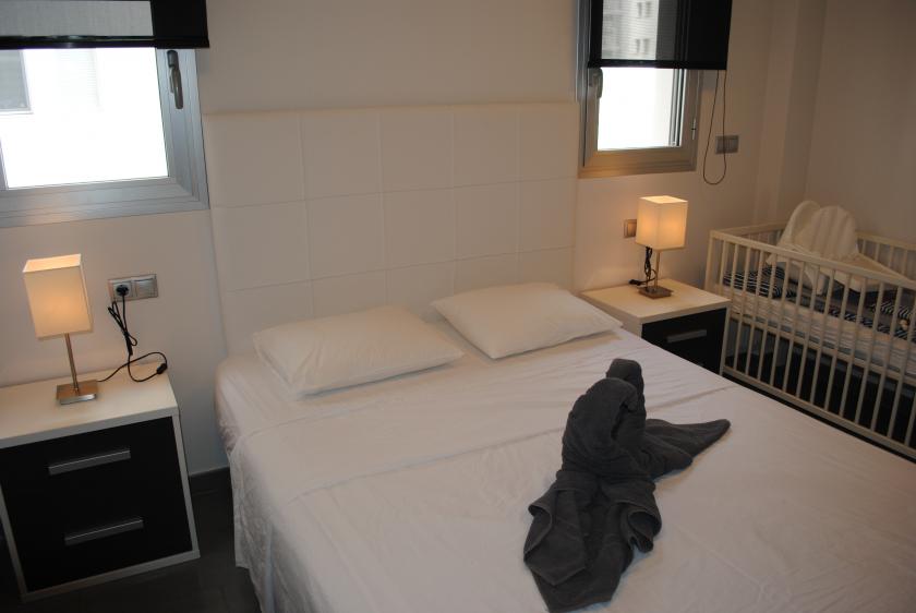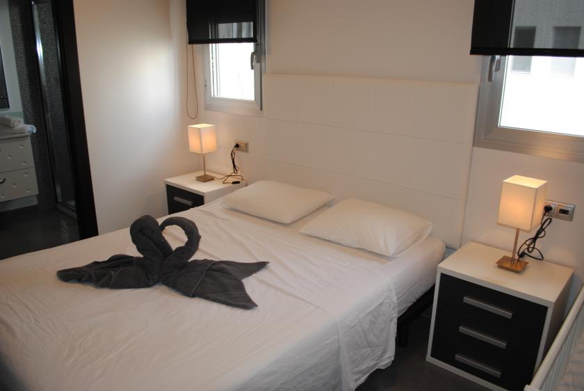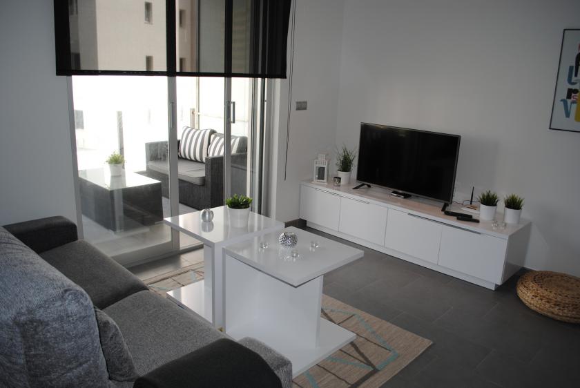 Denna modernt inredda lägenhet ligger på andra våningen och har designats noggrant för att ge gott om naturligt ljus. Möblerna och finishen är av hög kvalitet och utrymmet utnyttjas optimalt. Det finns 2 sovrum med 1 dubbelsäng och 2 enkelsängar, 2 badrum med handdukstork och dusch + duschmöjlighet. Vardagsrummet är möblerat med en bäddsoffa, luftkonditionering (varmt och kallt), golvvärme, 42-tums platt-TV, SAT-TV och internet via WiFi.