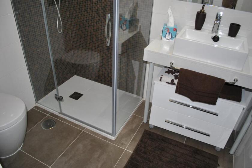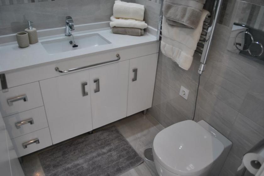 Lägenheten har ett stort vardagsrum möblerat med matbord och lädersofor. Den har två sovrum med plats för 1 x 2 och 2 x 1 sängar, samt två badrum med dusch. Andra bekvämligheter inkluderar luftkonditionering, LED-TV med satellitkanaler och Wi-Fi. Det öppna köket är fullt utrustat med nödvändiga faciliteter, inklusive diskmaskin. Det finns även varmvattenvärme som säkerställer ett bekvämt inomhusklimat under vintermånaderna.