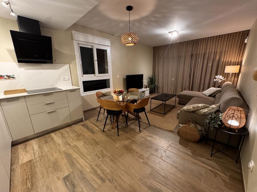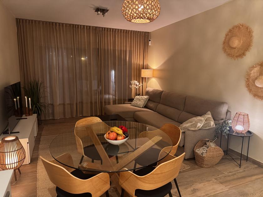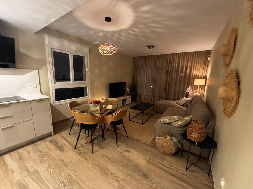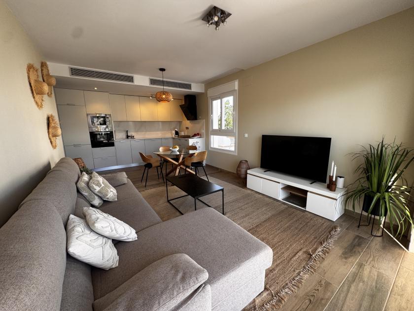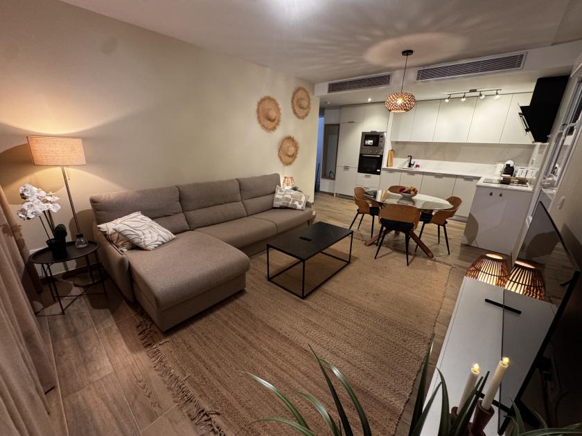 Det inbjudande vardagsrummet är utrustat med en bekväm soffa, matbord och stolar, hög hastighets WiFi (300 MB) och en SMART-TV. Det öppna köket är fullt utrustat med alla nödvändiga apparater, inklusive diskmaskin, vilket gör det perfekt för både avkoppling och underhållning.