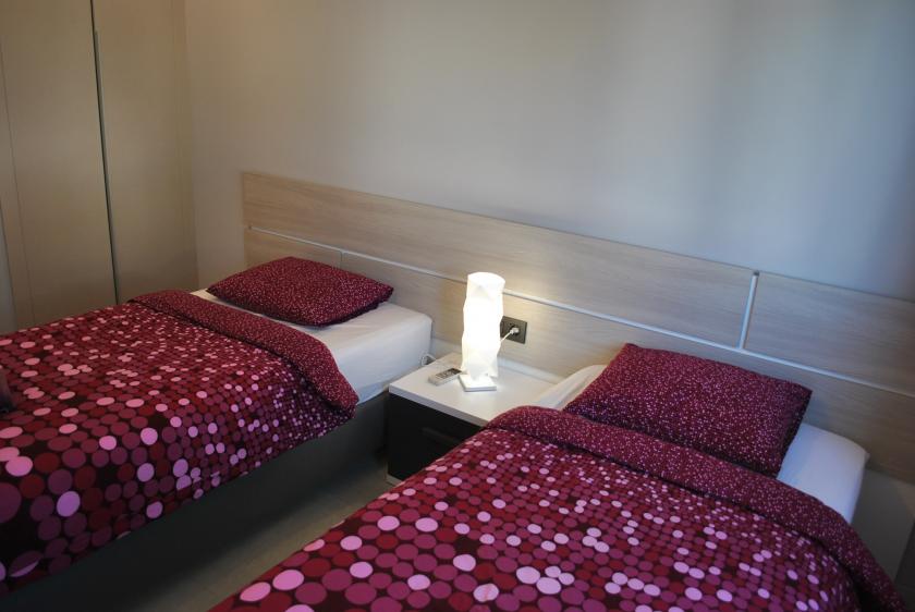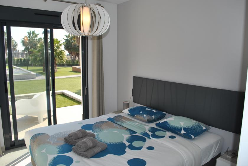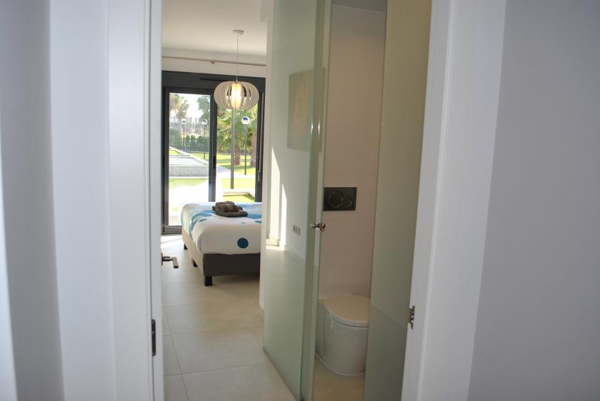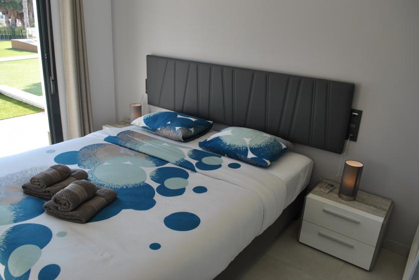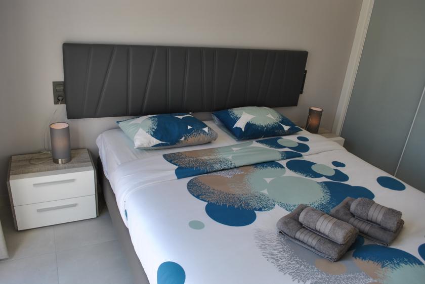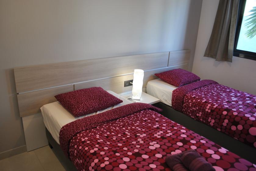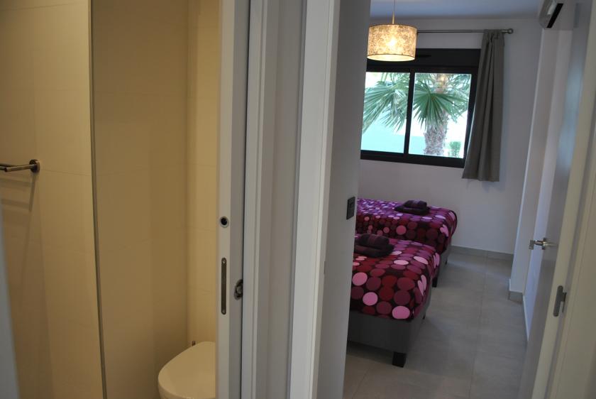 Sovrummen med 1 x 2 och 2 x 1 sängar är utrustade med inbyggda garderober och varje har ett privat badrum. De bekväma badrummen inkluderar en walk-in dusch, toalett, spegel med belysning, hårtork och förvaringsutrymme. Lakan finns tillgängliga, strandhanddukar måste du själv ta med. Både sovrummen och vardagsrummet/köket är utrustade med luftkonditionering, varm och kall.