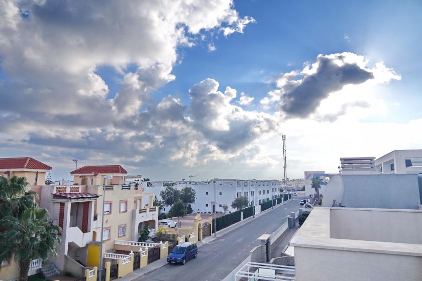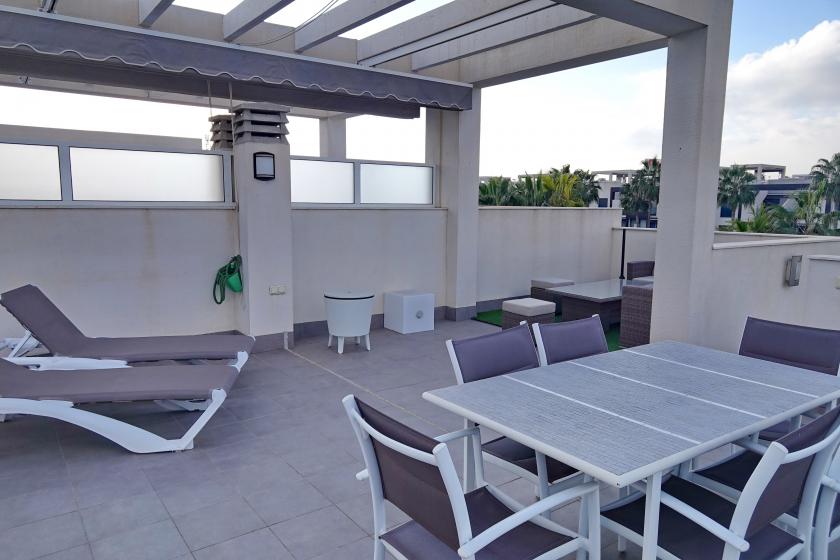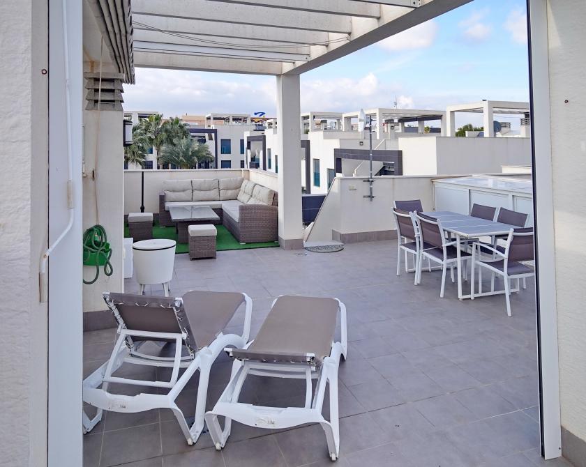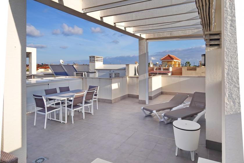 Denna takvåning har ett bra läge, bara 200 meter till fots från CC La Zenia Boulevard. Den är utrustad med all komfort du behöver för en trevlig vistelse. Denna egenskap har ett rymligt vardagsrum, 2 sovrum, 1 x 2 + 2 x 1 sängplatser och 2 badrum med duschmöjligheter. Det finns en balkong och en rymlig takterrass på 55 m², utrustad med bord + stolar, 2 solstolar och en pergola. Härifrån har du en fin utsikt över den gemensamma trädgården, poolen och de omgivande områdena.