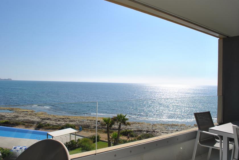 Denna lyxiga lägenhet med spektakulär havsutsikt ligger på tredje våningen i denna nya havsnära utveckling i Punta Prima. Lägenheten har ett rymligt vardagsrum med luftkonditionering, en LCD SMART IPTV och trådlöst internet. Det finns två sovrum, inklusive ett master bedroom med eget badrum, ett andra sovrum med två enkelsängar och en bäddsoffa i vardagsrummet för en femte person ( barn ).