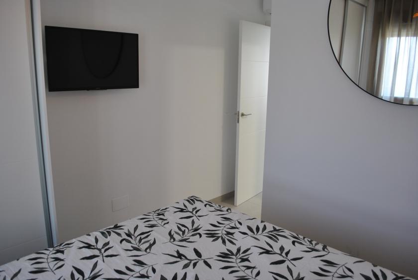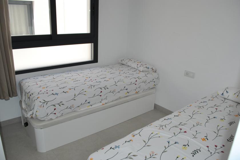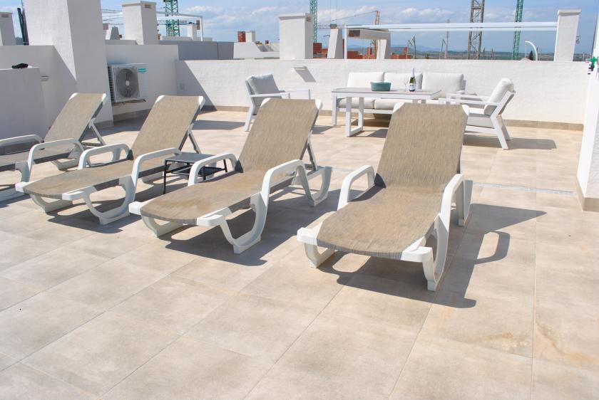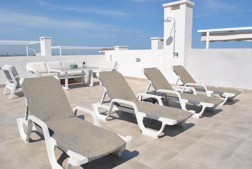 Denna lyxiga lägenhet på översta våningen har 2 sovrum med inbyggda garderober, 2 x 2 sovplatser och 2 badrum med dusch + dusch, båda försedda med golvvärme, fullt möblerad med integrerad luftkonditionering, motoriserade persienner, en rymlig och fullt möblerad balkong ( på 13m2) och en takterrass (på 68m2) med utsikt över de gemensamma utrymmena och Saltsjöarna i Torrevieja.