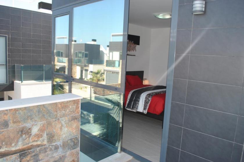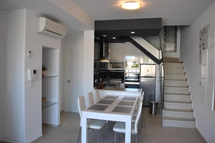 Från vardagsrummet har du tillgång till en fullt utrustad terrass som vetter mot söder. På övervåningen finns ett master bedroom med eget badrum och direkt tillgång till en balkong utrustad med en loungeset.