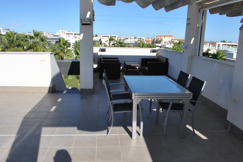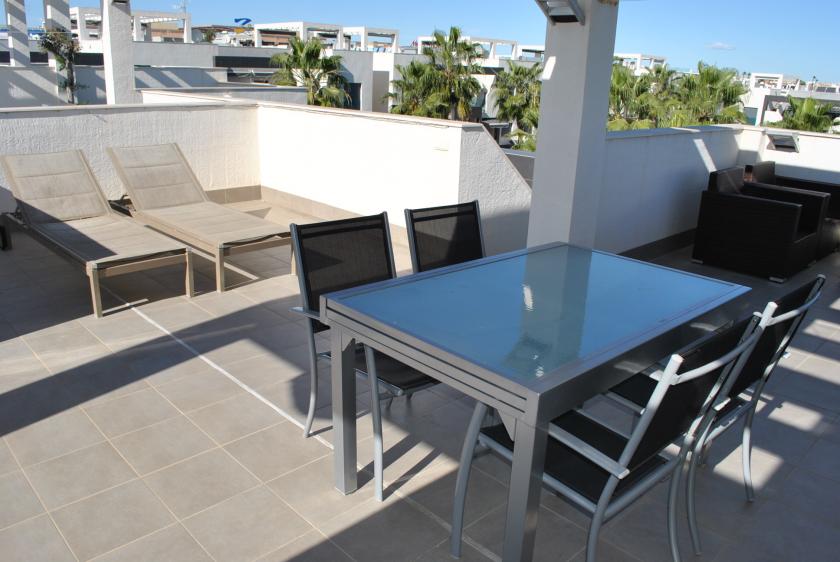 Denna vackra taklägenhet i Oasis Beach La Zenia ligger i en bostadspark i den allra södra delen av Costa Blanca, på en plats som kallas Orihuela Costa. Den ligger inom gångavstånd från de fina sandstränderna och alla bekvämligheter som kan tillfredsställa dina dagliga behov, såsom många butiker, restauranger och det nya köpcentrumet La Zenia Boulevard, samt La Zenia Center och kusten, som båda är värda ett besök. Dessutom ligger den välkända och livliga staden Torrevieja en kort bilresa bort.