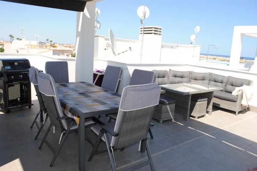 Denna vackra takvåning belägen i Residencial Oasis Beach 7 i Punta Prima har 2 sovrum med plats för 1 x 2 + 3 x 1 personer och 2 badrum med dusch + duschfaciliteter. Från balkongen och takterrassen har du utsikt över den gemensamma trädgården där poolen ligger. Vardagsrummet är inrett med hög standard och modern stil, och är utrustat med luftkonditionering, LCD-TV med SAT-kanaler och WIFI-anslutning. Härifrån har du lätt åtkomst till terrassområdena.