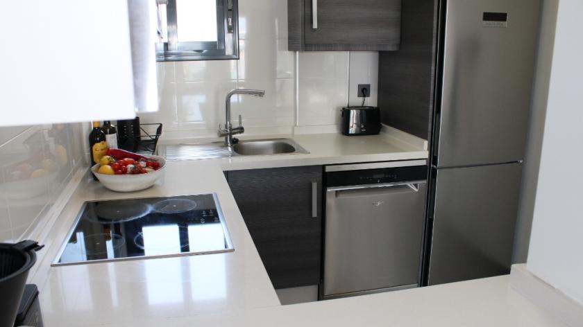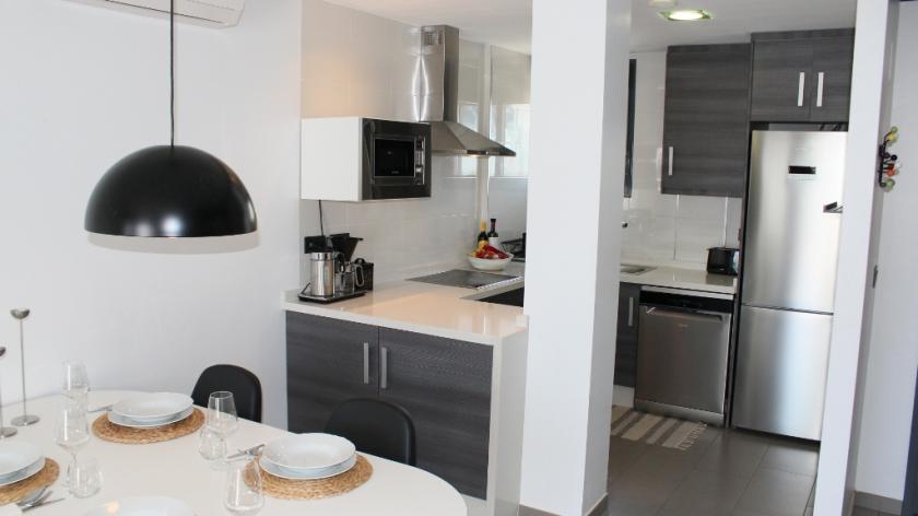 Köket är fullt utrustat med diskmaskin och det smakfullt inredda vardagsrummet är dekorerat med SAT-TV, internationella kanaler, WiFi och luftkonditionering, både varmt och kallt. Balkongen och takterrassen på 55 m² är fullt möblerade och här har du utsikt över den vackra innergården där poolen finns. Den underjordiska parkeringen ger plats för att parkera din bil.