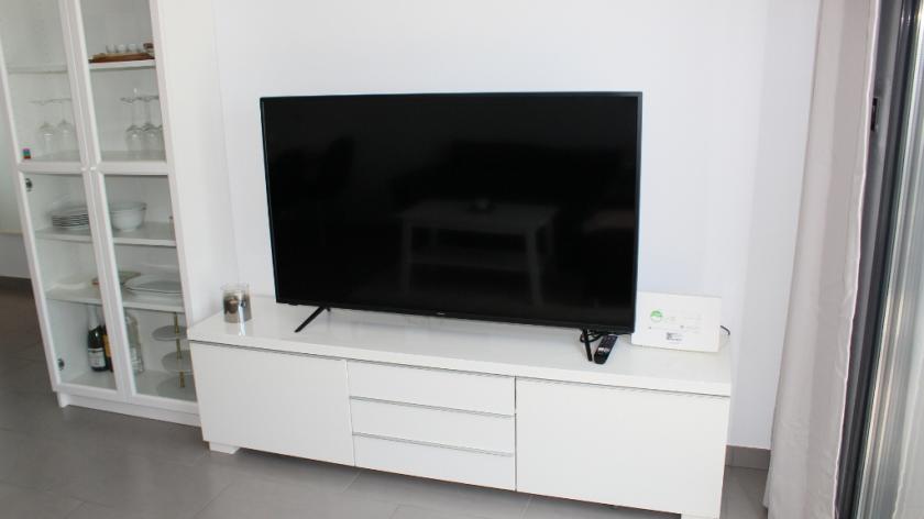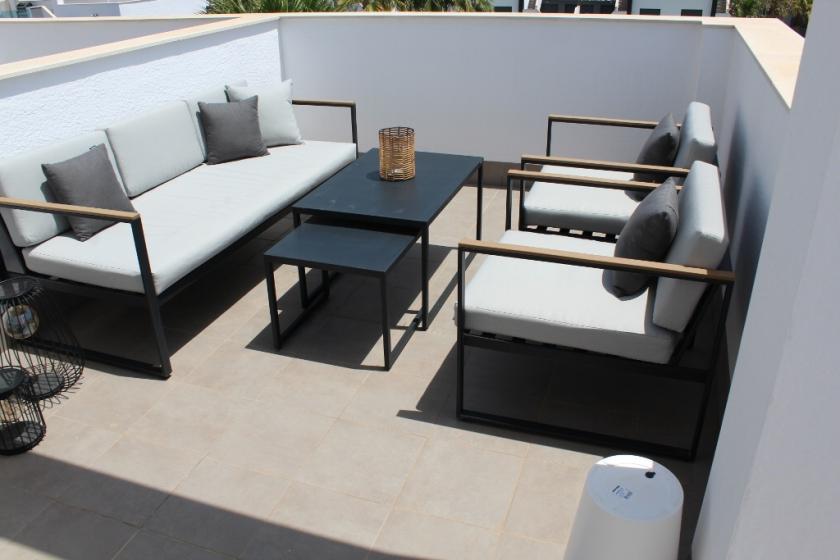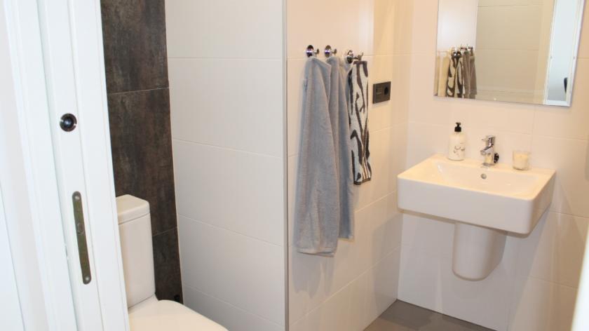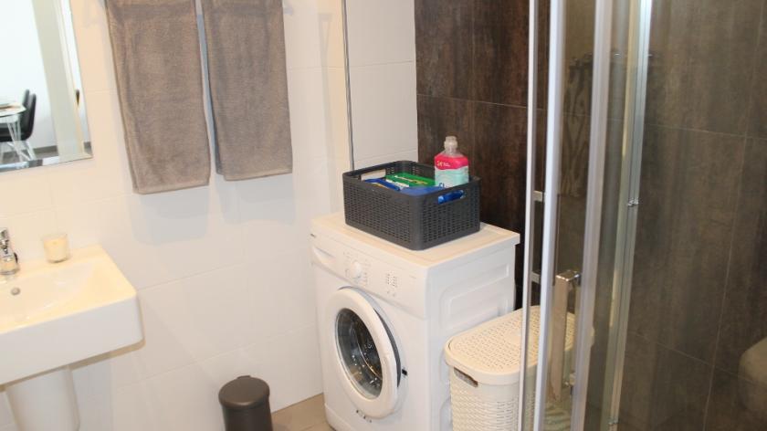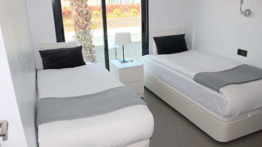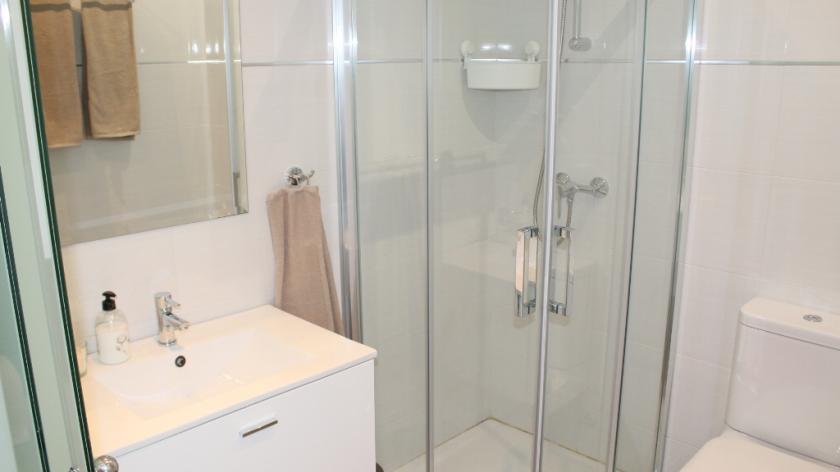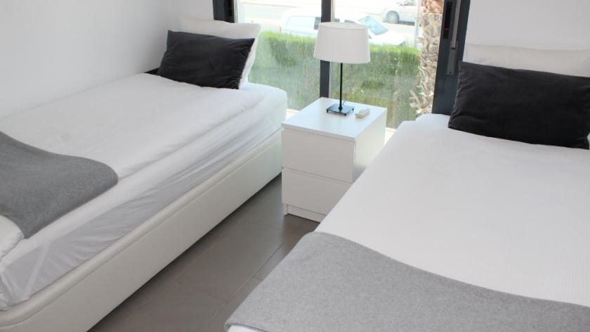 Denna moderna lägenhet är möblerad med 2 sovrum, 1 x dubbelsäng + 2 x enkelsängar och 2 badrum, med dusch + duschmöjlighet. Det finns en bäddsoffa eller en extra säng för en 5:e person med en åldersgräns på 18 år.